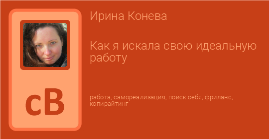 Меня зовут Ирина Конева, и я копирайтер, помогаю малому бизнесу продавать товары и услуги при помощи текста. Была я копирайтером, конечно же, не всегда. Более того, я даже не уверена, что навсегда им останусь. Но я совершенно точно знаю, что отныне буду работать только там, где мне хорошо. Под этим «хорошо» я понимаю деятельность, которая интересна, адекватно оплачивается и дает возможность реализовать себя.