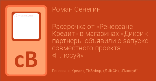 Банк «Ренессанс Кредит», один из лидеров в сфере потребительского кредитования в России, и ГК «ДИКСИ», одна из ведущих российских компаний в сфере торговли продуктами питания и товарами повседневного спроса, объявили о начале сотрудничества. Теперь покупатели могут получить в магазинах «ДИКСИ» карту «Плюсуй», которая позволяет стать участником программы лояльности ретейлера и подключить рассрочку от банка. В настоящий момент карты доступны только в магазинах Санкт-Петербурга и Ленинградской области.