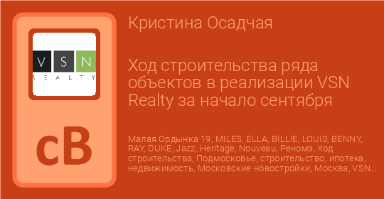 Компания VSN Realty сообщает новости со строительных площадок ЖК «Малая Ордынка 19», «Реномэ» и «Jazz» за начало сентября.