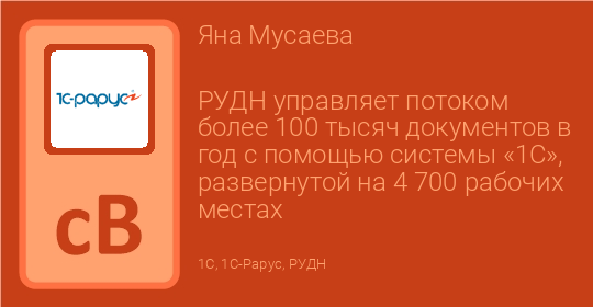 РУДН совместно с «1С-Рарус» автоматизировали управление документооборотом с помощью «1С:Документооборот государственного учреждения». Новая система объединила 4 700 пользователей и решила задачи по созданию, маршрутизации и хранению более 100 тысяч документов в год.