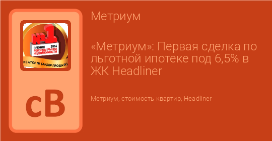 В первые же дни после запуска программы по субсидированию ипотечной ставки компания «Метриум» провела сделку с привлечением льготной ипотеки в жилом квартале бизнес-класса Headliner. Клиент приобрел квартиру в третьей очереди проекта, которая вышла в продажу в начале апреля. Сумма кредита, предоставленного Альфа-Банком, составила 5 млн рублей при бюджете покупки свыше 13 млн рублей. Девелопер проекта – ГК «КОРТРОС». Партнер по реализации новостройки – компания «Метриум».