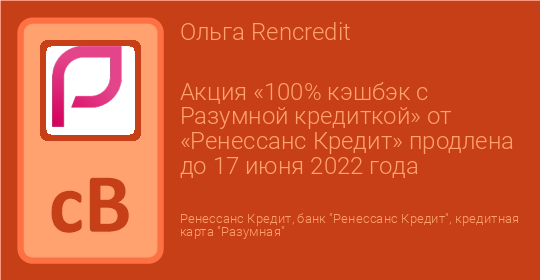 Акция «100% кэшбэк с Разумной кредиткой» от «Ренессанс Кредит» продлена до 17 июня 2022 года