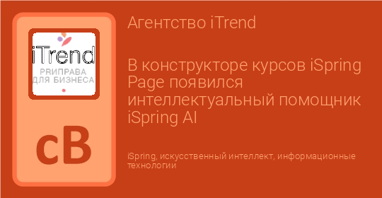 Компания iSpring, разработчик решений для корпоративного онлайн-обучения, внедрила в облачный конструктор быстрого создания курсов iSpring Page интеллектуального помощника iSpring AI, созданного на основе языковой модели GPT 3.5 от OpenAI.