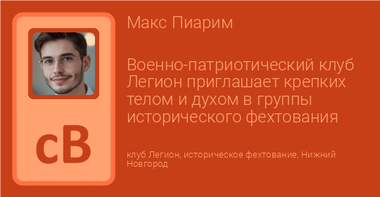 Нижегородский военно-патриотический клуб Легион, действующий в Нижнем Новгороде с 2006 года, проводит открытый отбор участников (формирование групп) на секции по историческому фехтованию на 2023-2024 годы обучения. Ближайшая встреча состоится в воскресение, 17 сентября.