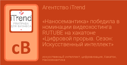 Команда сотрудников российского разработчика решений на базе нейросетей «Наносемантика» одержала победу на хакатоне «Цифровой прорыв. Сезон: Искусственный интеллект» в Перми. Разработчики «Наносемантики» взяли первое место в номинации от видеохостинга RUTUBE – «Распознавание именованных сущностей в заголовках и описаниях к видео».