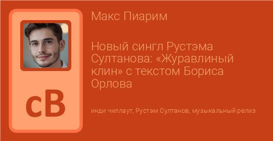 Новый музыкальный трек Рустэма Султанова "Журавлиный клин", который он выпустил в соавторстве с Борисом Орловым - это не просто песня, это возвращение к отечественным традициям популярной музыки. С запоминающимся и интуитивно "правильным" текстом, новинка от неординарного для нашей сцены автора и исполнителя, продолжает серию его музыкальной кладези, отличающейся чёткой текстовой и музыкальной выверенностью.