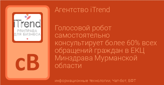 БФТ-Холдинг совместно с компанией BSS внедрили виртуального ассистента для контакт-центра Государственного областного автономного учреждения здравоохранения «Мурманский областной Центр специализированных видов медицинской помощи» (ГОАУЗ «МОЦСВМП»). Теперь каждый человек, обратившийся в единый региональный контакт-центр здравоохранения региона (ЕКЦ), может решить большинство вопросов без участия оператора.