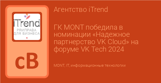 ГК MONT победила в номинации «Надежное партнерство VK Cloud» на форуме VK Tech 2024