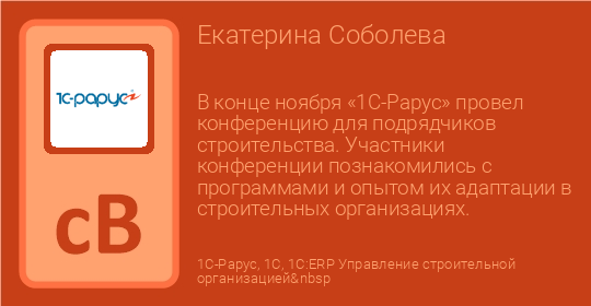 В конце ноября «1С-Рарус» провел конференцию для подрядчиков строительства. Участники конференции познакомились с программами и опытом их адаптации в строительных организациях.