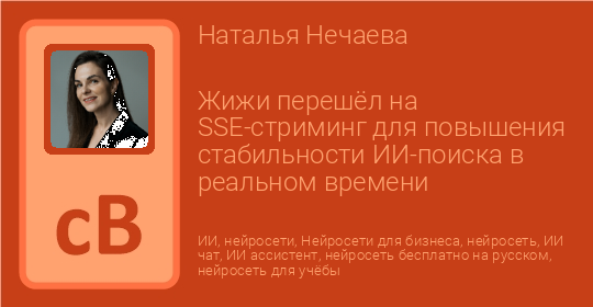 Компания «Жижи» внедрила технологию SSE (Server-Sent Events) в архитектуру своего одноименного ИИ-поиска, обеспечив более устойчивый обмен данными и точную синхронизацию пользовательских сессий. Обновление нацелено на повышение надежности интерфейса, в случаях, когда пользователи работают одновременно с несколькими чатами или их интернет-соединение нестабильно.
