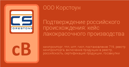 Производитель лакокрасочной продукции обратился в компанию «Корстоун» с задачей включить свою продукцию в реестр Минпромторга РФ. Основная цель клиента — получить официальное подтверждение локализации производства, чтобы участвовать в закупках и проектах с требованиями импортонезависимости.