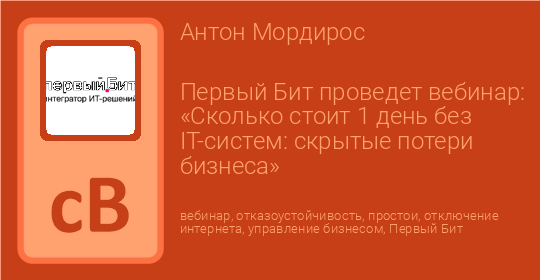 Эксперты Первого Бита 29 апреля в 11:00 (МСК) проведут бесплатный вебинар на тему «Сколько стоит 1 день без IT- систем: скрытые потери бизнеса».